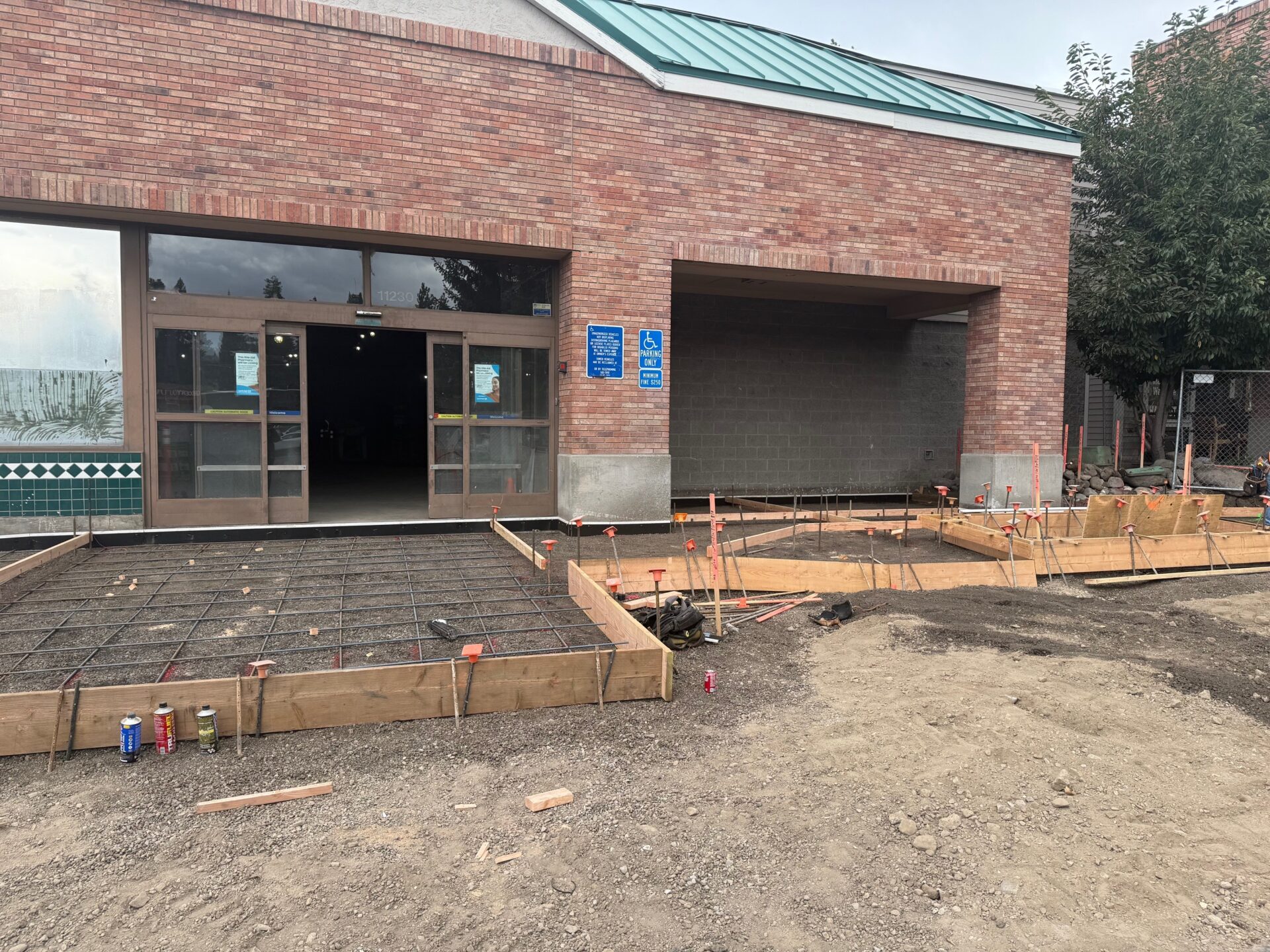 A new gable roof has been framed, and ADA-compliant concrete walkways have been poured along the exterior. New siding has also been installed, giving the facility a fresh, modern look. The construction team continues to complete sitework upgrades ahead of the October 15 deadline.